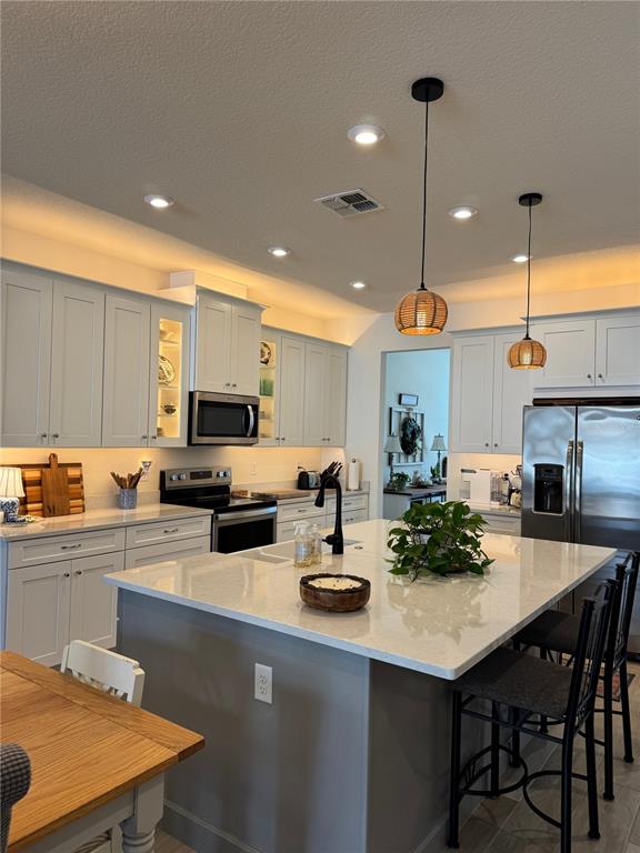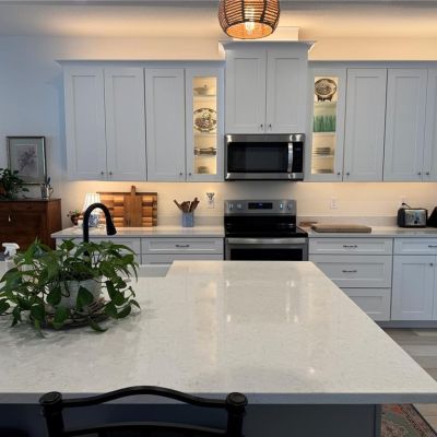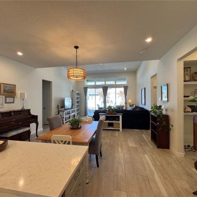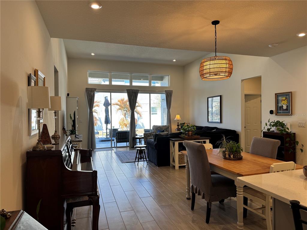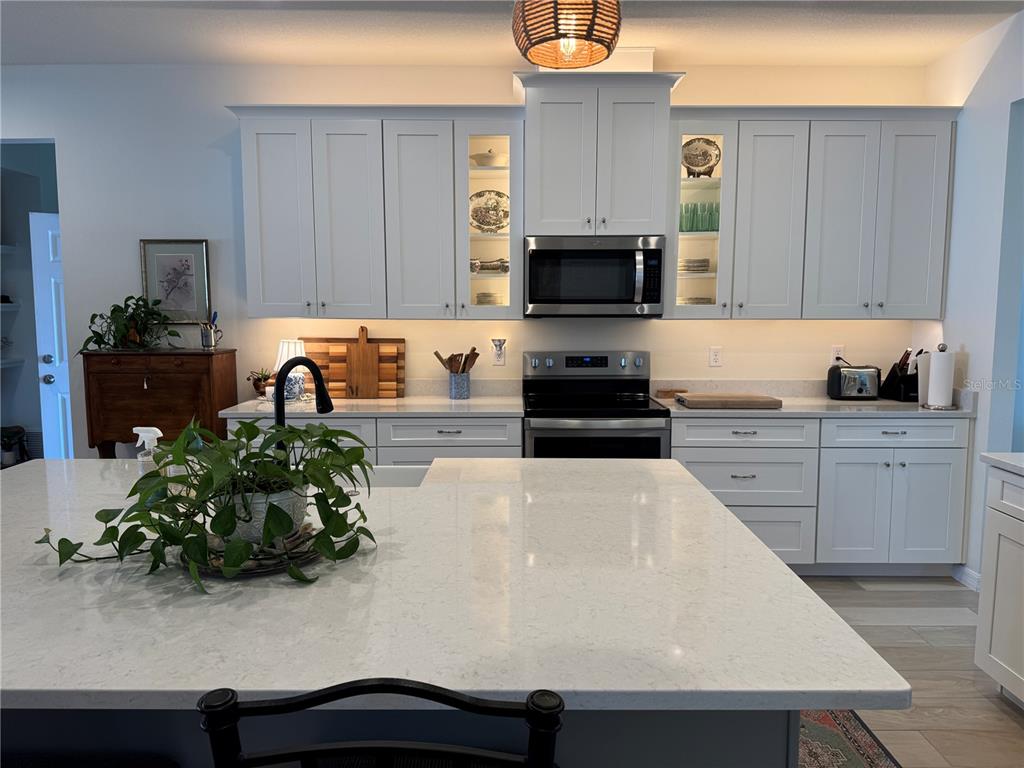 Eating Space In Kitchen, Kitchen/Family Room Combo, Open Floorplan, Solid Surface Counters, Solid Wood Cabinets, Stone Counters, Thermostat, Tray Ceiling(s), Window Treatments