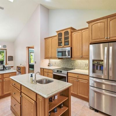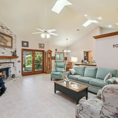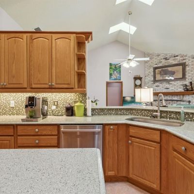 Ceiling Fan(s), High Ceilings, Open Floorplan, Primary Bedroom Main Floor, Skylight(s), Solid Surface Counters, Solid Wood Cabinets, Split Bedroom, Stone Counters, Vaulted Ceiling(s), Walk-In Closet(s)