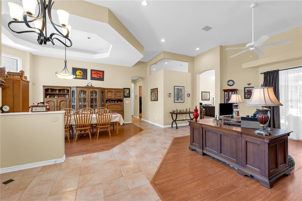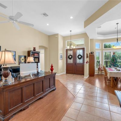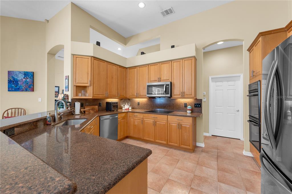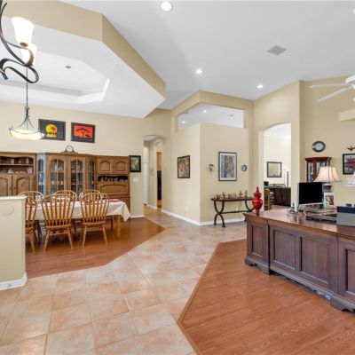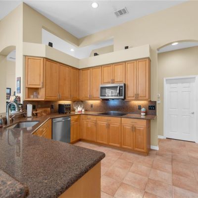 Ceiling Fan(s), Eating Space In Kitchen, High Ceilings, Kitchen/Family Room Combo, Open Floorplan, Primary Bedroom Main Floor, Solid Surface Counters, Solid Wood Cabinets, Split Bedroom, Stone Counters, Thermostat, Vaulted Ceiling(s), Walk-In Closet(s), Window Treatments