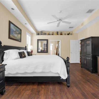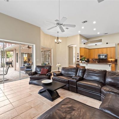 Ceiling Fan(s), Eating Space In Kitchen, High Ceilings, Kitchen/Family Room Combo, Open Floorplan, Primary Bedroom Main Floor, Solid Surface Counters, Solid Wood Cabinets, Split Bedroom, Stone Counters, Thermostat, Vaulted Ceiling(s), Walk-In Closet(s), Window Treatments