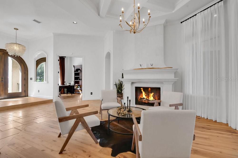 Ceiling Fan(s), Coffered Ceiling(s), Crown Molding, Dry Bar, Eating Space In Kitchen, High Ceilings, Primary Bedroom Main Floor, Solid Surface Counters, Solid Wood Cabinets, Stone Counters, Thermostat, Tray Ceiling(s), Wet Bar, Window Treatments