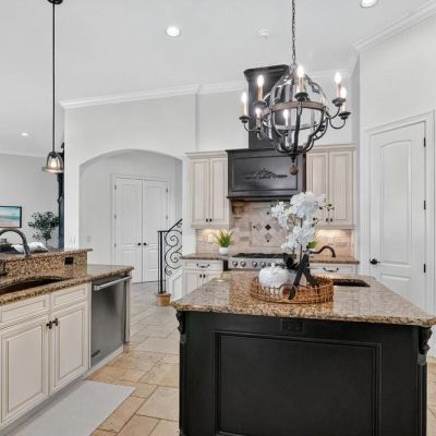Ceiling Fan(s), Coffered Ceiling(s), Crown Molding, Dry Bar, Eating Space In Kitchen, High Ceilings, Primary Bedroom Main Floor, Solid Surface Counters, Solid Wood Cabinets, Stone Counters, Thermostat, Tray Ceiling(s), Wet Bar, Window Treatments