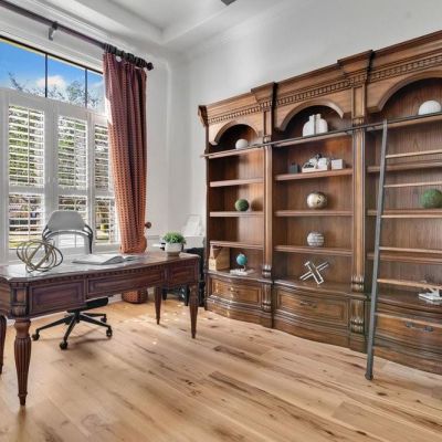 Ceiling Fan(s), Coffered Ceiling(s), Crown Molding, Dry Bar, Eating Space In Kitchen, High Ceilings, Primary Bedroom Main Floor, Solid Surface Counters, Solid Wood Cabinets, Stone Counters, Thermostat, Tray Ceiling(s), Wet Bar, Window Treatments