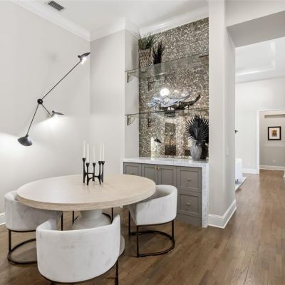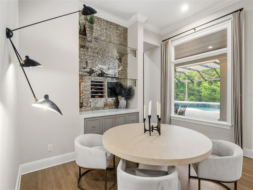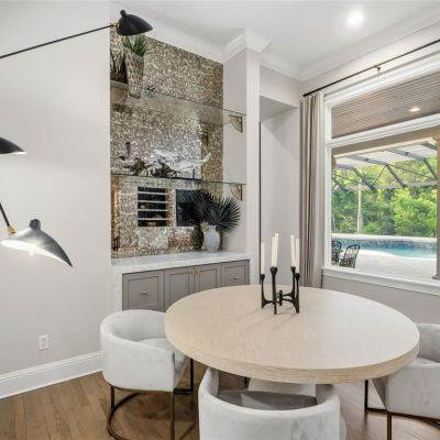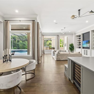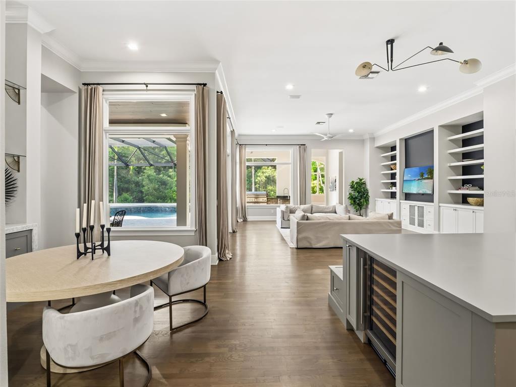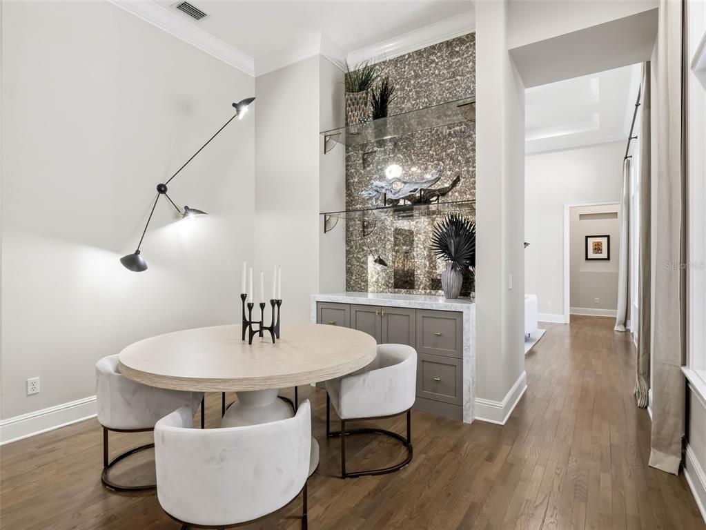 Built-in Features, Ceiling Fan(s), Coffered Ceiling(s), Crown Molding, Dry Bar, Eating Space In Kitchen, High Ceilings, Kitchen/Family Room Combo, Primary Bedroom Main Floor, Split Bedroom, Stone Counters, Thermostat, Tray Ceiling(s), Vaulted Ceiling(s), Walk-In Closet(s), Window Treatments