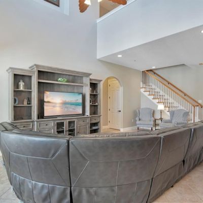 Ceiling Fan(s), Crown Molding, Eating Space In Kitchen, High Ceilings, Kitchen/Family Room Combo, Living Room/Dining Room Combo, Open Floorplan, Primary Bedroom Main Floor, Solid Surface Counters, Solid Wood Cabinets, Stone Counters, Thermostat, Tray Ceiling(s), Walk-In Closet(s)