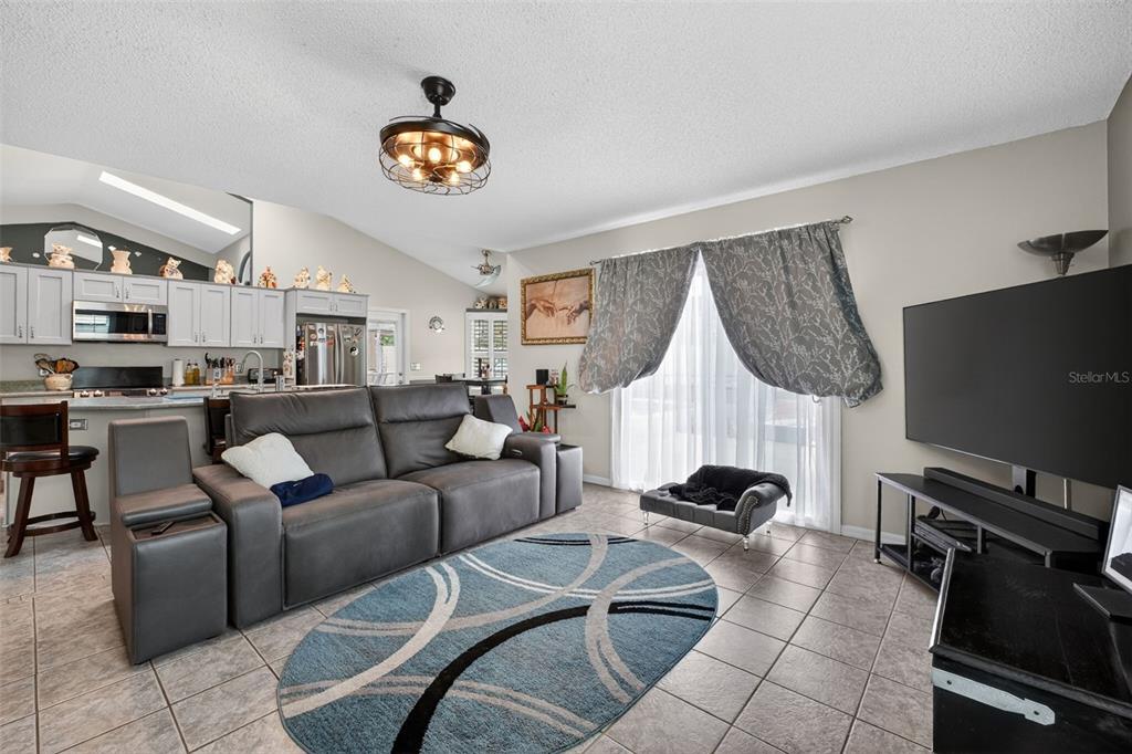 Ceiling Fan(s), Eating Space In Kitchen, High Ceilings, Kitchen/Family Room Combo, Primary Bedroom Main Floor, Solid Wood Cabinets, Split Bedroom, Stone Counters, Thermostat, Vaulted Ceiling(s)
